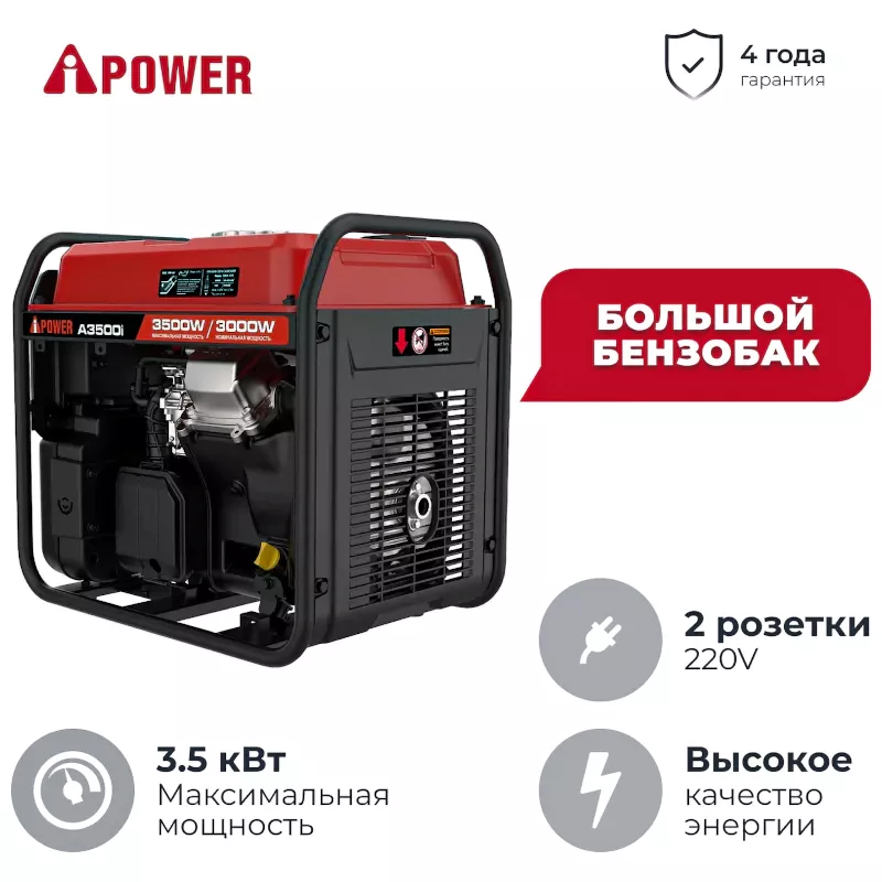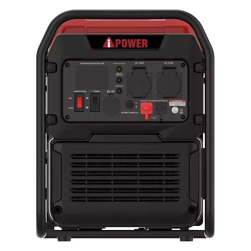 Бензиновый генератор A-iPower A3500i – инверторная модель с максимальной мощностью 3,5 кВт, которая обеспечит электропитанием инструмент в вашем гараже, домашней мастерской, на дачном участке или небольшой строительной площадке. Устройство обладает многофункциональным дисплеем, системой защиты и поддерживает экономичный режим работы.