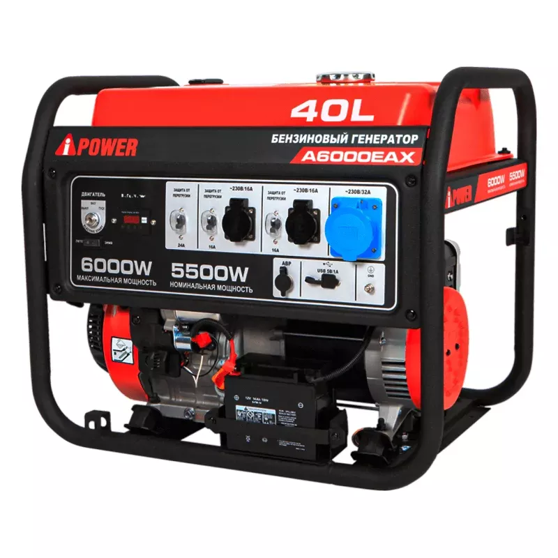 Бензиновый генератор A-iPower A6000EAX оснащен электростартером и разъемом для подключения блока автоматического ввода резерва — АВР. Отличительная черта этой модели — способность выдерживать кратковременную индуктивную нагрузку в 9,4 кВА, что позволяет подключать потребителей с высоким пусковым током. Устройство служит автономным источником однофазного тока для различного электрооборудования, в совокупности потребляющего 5,5 кВт. Благодаря большому топливному баку на 40 л электрогенератор работает без дозаправки в течение 11 часов при 100%-ной нагрузке.