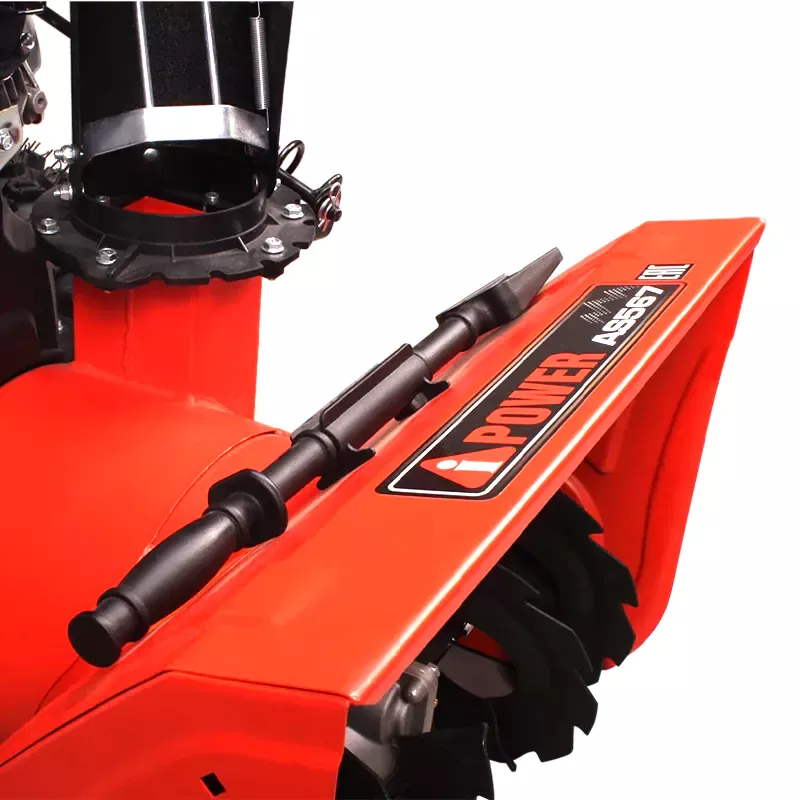 Снегоуборщик A-iPower AS567 откидывает снежную массу на расстояние до 12 м. Рычаг поворота разгрузочного желоба вынесен на рукоятку. Вы можете менять направление выброса снега на 190° и регулировать дальность, наклоняя крышку на желобе.