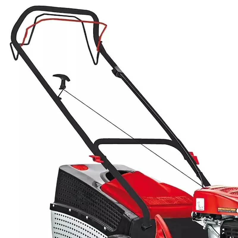 Для удобства управления газонокосилкой, все основные функции: ручка запуска, рычаги привода и включения ножа - выведены на регулируемую рабочую рукоять. Для удобства хранения, рукоять может складываться. Чтобы обеспечить удобный и уверенный захват, в верхней части имеются накладки из нескользящего прорезиненного материала, а сама рукоять легко регулируется под любой рост.
