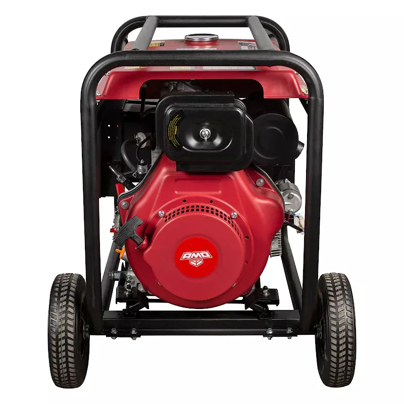 Дизельный генератор AMO ADG 5500E обеспечивает автономное энергоснабжение различных электрических устройств однофазным током. Допускается подключение бытовой техники, осветительных приборов и электроинструментов, совокупная потребляемая мощность которых составляет 5 кВт. Мобильная электростанция смонтирована на раме из усиленного металлического профиля, оборудована четырехтактным двигателем мощностью 8 л.с. с воздушным охлаждением и электростартером.