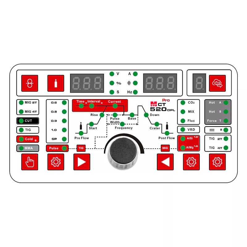 В многофункциональном сварочном аппарате ANDELI MCT-520 DPL PRO предусмотрено синергетическое управление. Оно отлично подходит новичкам или специалистам, которые выполняют типичные задачи на производстве. После того как вы зададите на панели управления тип электродной проволоки и её размер, аппарат автоматически подберет рабочие параметры для качественной сварки.