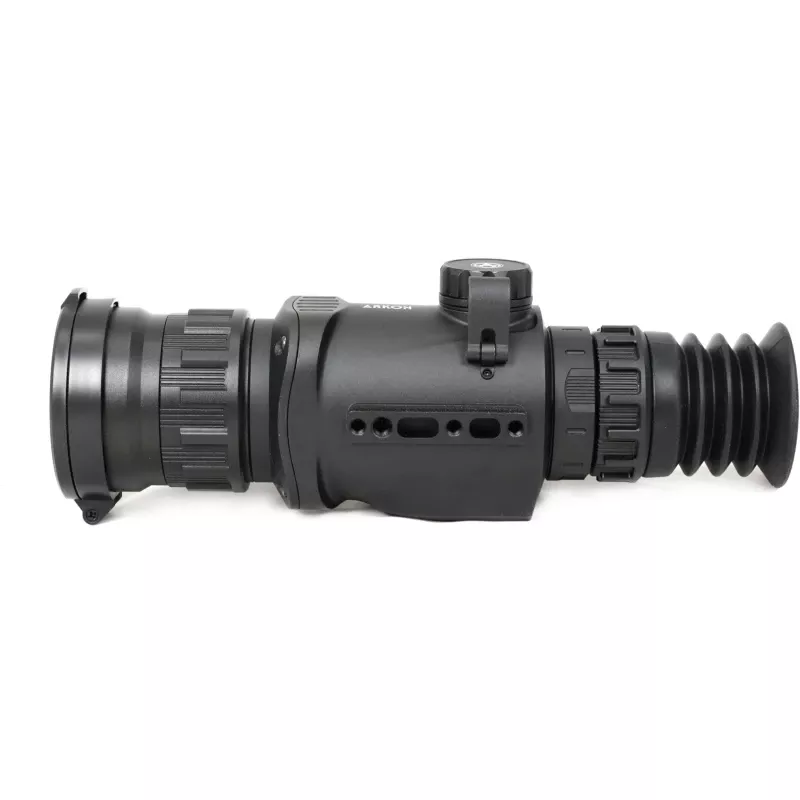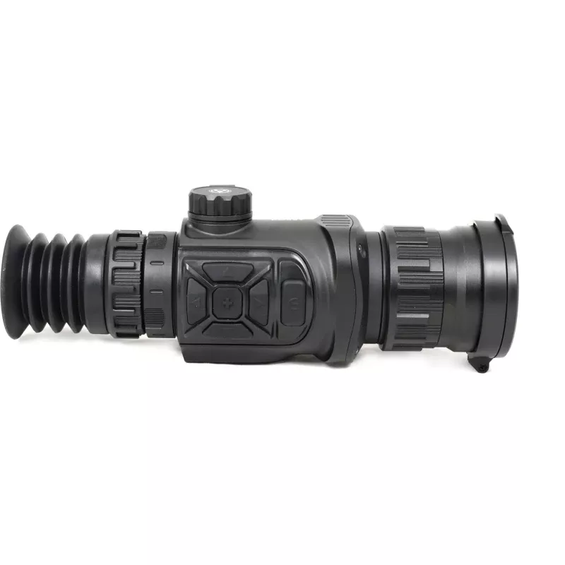 Прицел оснащен мощным германиевым объективом с фокусным расстоянием 50 мм и апертурой F1.0, обеспечивающим начальное увеличение 2,4х. Для дополнительного масштабирования изображения предусмотрена функция Digital zoom с диапазоном от 1х до 8х, что позволяет плавно или дискретно увеличить кратность до 19,2х. На минимальном увеличении угол поля зрения (FOV) составляет 8,8° x 7,0°, охватывая область пространства размером 15,4 на 12,2 метра на дистанции 100 метров. Широкий угол обзора позволяет стрелку контролировать значительное пространство и эффективно ориентироваться на местности, что особенно важно при наблюдении и стрельбе на дальних дистанциях. Резкость на нужную дистанцию настраивается с помощью низкопрофильного кольца на объективе.
