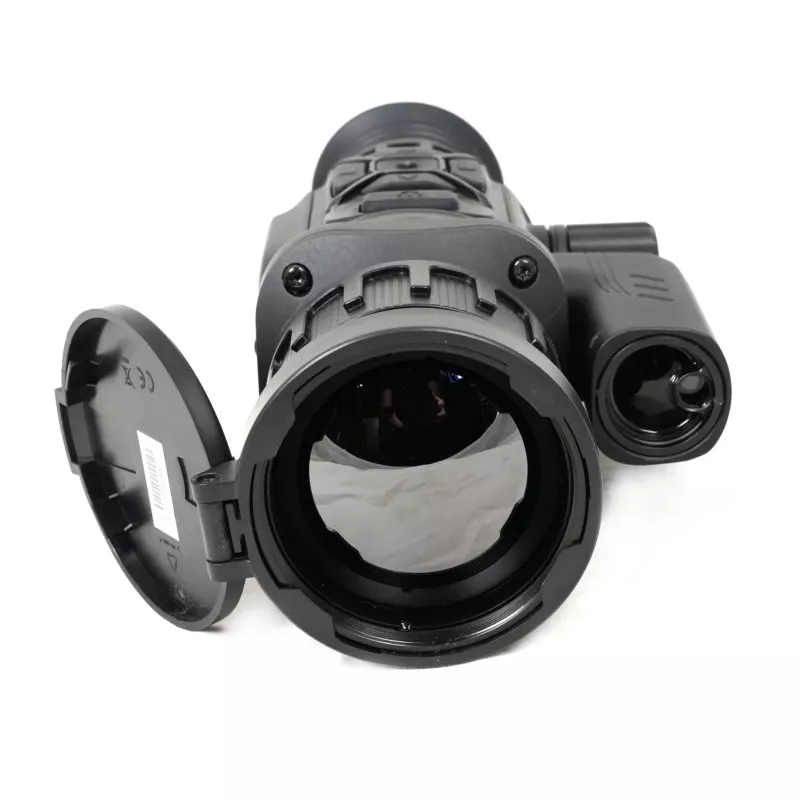 Тепловизионный прицел оснащен лазерным дальномером, способным оперативно измерять расстояния в диапазоне от 10 до 1200 метров. Излучатель и приемник находятся в одном оптическом канале, а само устройство удачно вписано в общий концепт конструкции и не мешает обзору. Дальномер работает на длинах волн 905 нм и отвечает требованиям первого класса лазерной безопасности. Погрешность измерений составляет ±1 м. Доступно 2 режима работы: одиночное измерение и режим непрерывного сканирования.