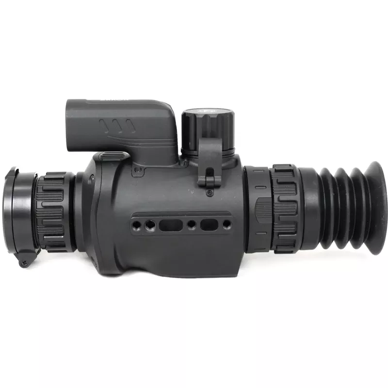Тепловизионный прицел оснащен лазерным дальномером, способным оперативно измерять расстояния в диапазоне от 10 до 1200 метров. Излучатель и приемник находятся в одном оптическом канале, а само устройство удачно вписано в общий концепт конструкции и не мешает обзору. Дальномер работает на длинах волн 905 нм и отвечает требованиям первого класса лазерной безопасности. Погрешность измерений составляет ±1 м. Доступно 2 режима работы: одиночное измерение и режим непрерывного сканирования.