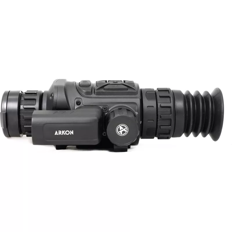 Оптический модуль Arkon Arma SR25 построен на длиннофокусном германиевом объективе 25мм/F1.0, имеющем показатель базовой кратности 3,1х. Для масштабирования изображения имеется цифровая функция Digital zoom, доступная в пределах от 1х до 4х. Благодаря этому максимальное увеличение составит 12,4х. Угол пространственного поля зрения FOV (Field of view) на минимальной кратности равен 7.0°x5.4°. В линейных размерах стрелок будет видеть перед собой область пространства размером 12,2 на 9,4 метра на удалении 100 метров. Фокусировка на дистанцию выполняется вручную, поворотом низкопрофильного кольца на объективе.