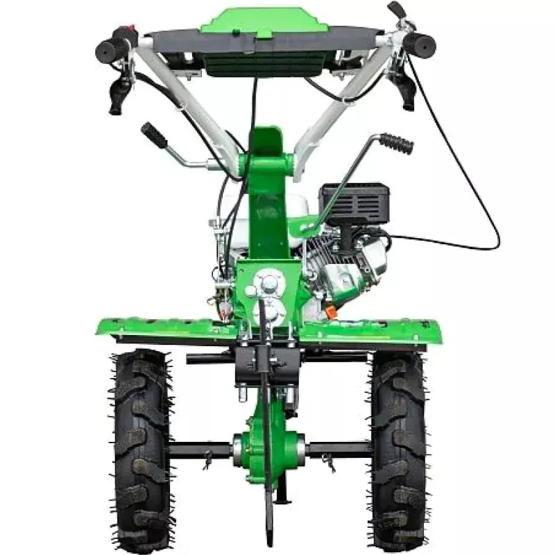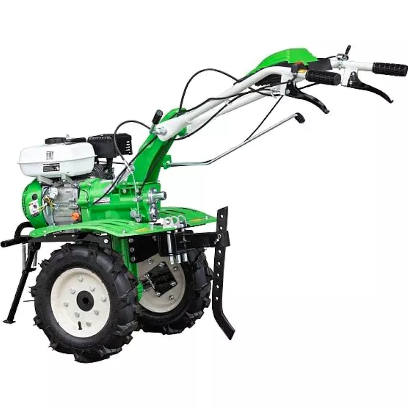 На шестигранные оси диаметром 23 мм можно установить колеса с глубоким протектором, фрезы или грунтозацепы. С помощью соответствующего навесного оборудования бензиновый мотоблок вспашет землю, сформирует грядки, окучит или выкопает картофель и другие корнеплоды, скосит траву, поможет перевезти грузы.