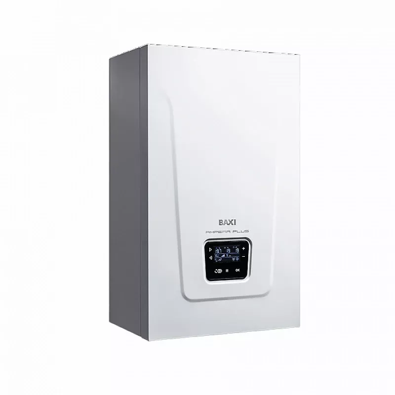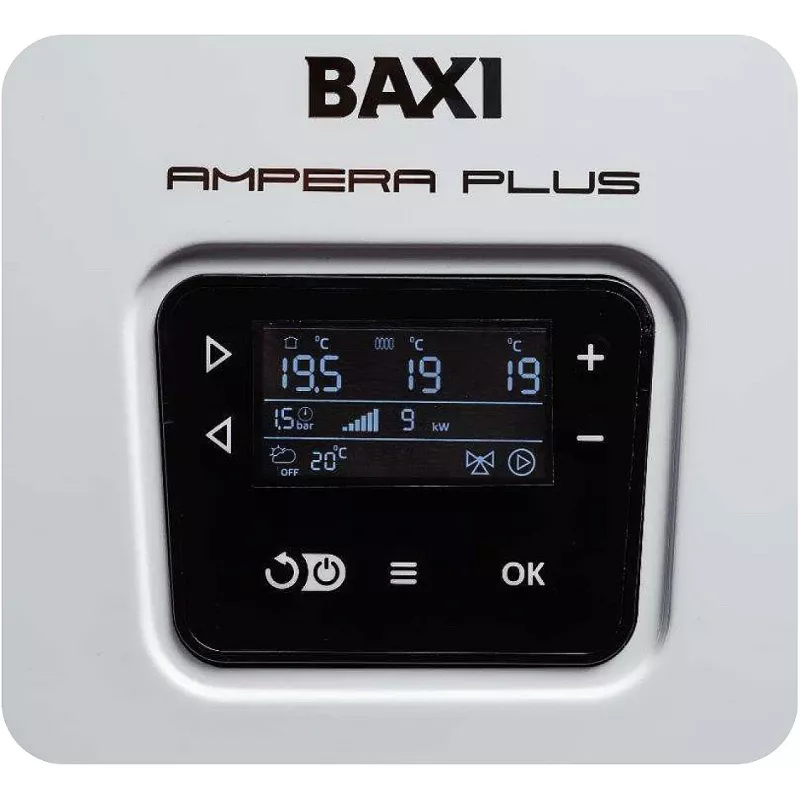 Электрический котел Baxi Ampera Plus 36 с одним контуром и ступенчатым переключением мощности служит для отопления помещений и, в случае подключения бойлера, для горячего водоснабжения. Встроенный термостат с часами реального времени работает согласно запрограммированным режимам. Датчик температуры окружающего воздуха обеспечивает автоматическую регулировку степени нагрева в зависимости от изменения погодных условий. Аппарат работает от трехфазной сети и поддерживает девять ступеней тепловой мощности: 4, 8, 12, 16, 20, 24, 28, 32 и 36 кВт. Объем теплоносителя в контуре циркуляции составляет 11 л.
