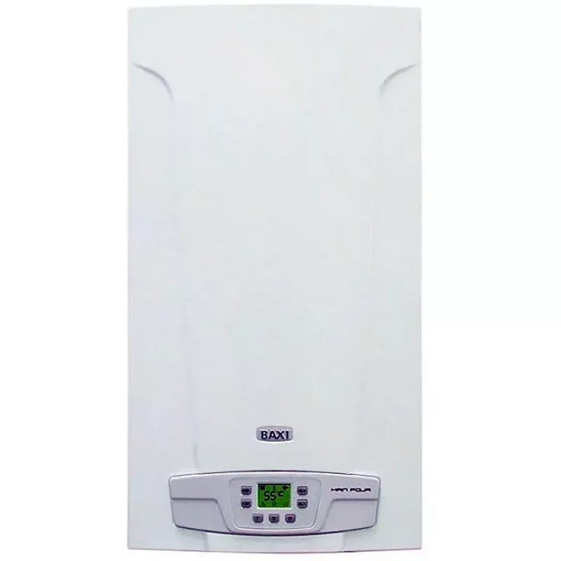 Газовый котел Baxi ECO FOUR 1.24 компактно размещается на стене благодаря небольшим габаритам. Крепления поставляются в комплекте. Оборудование позволяет отапливать жилые и хозяйственные помещения. Температуру можно плавно регулировать в диапазоне от 30_С до 85_С. Аппарат снабжен системами защиты от замерзания и перегрева, предохранительным клапаном давления, датчиками тяги и наличия пламени. В качестве топлива используется природный или сжиженный газ. Тепловая мощность составляет 24 кВт.