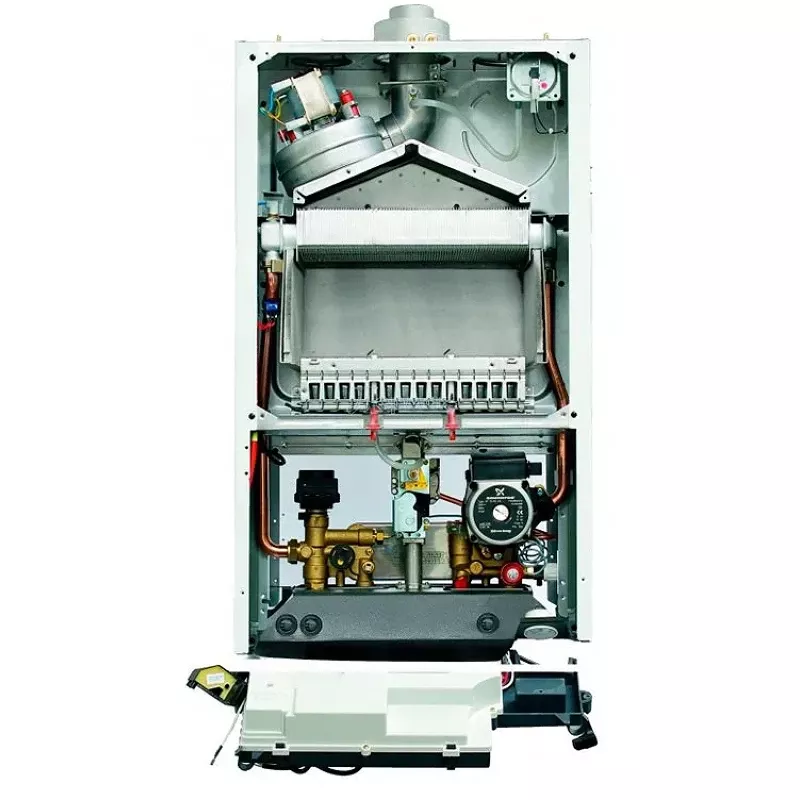 При опускании температуры воды в системе подачи ниже 5_С включается защита от замерзания. Котел Baxi LUNA-3 1.310 Fi автоматически отключается при недостаточном давлении и отсутствии воды благодаря оснащению гидравлическим прессостатом. Электрод наличия пламени обеспечивает безопасность горения. Термостат блокирует подачу газа в случае перегрева теплоносителя. Датчик тяги обеспечивает выключение горелки при неисправном дымоходе.