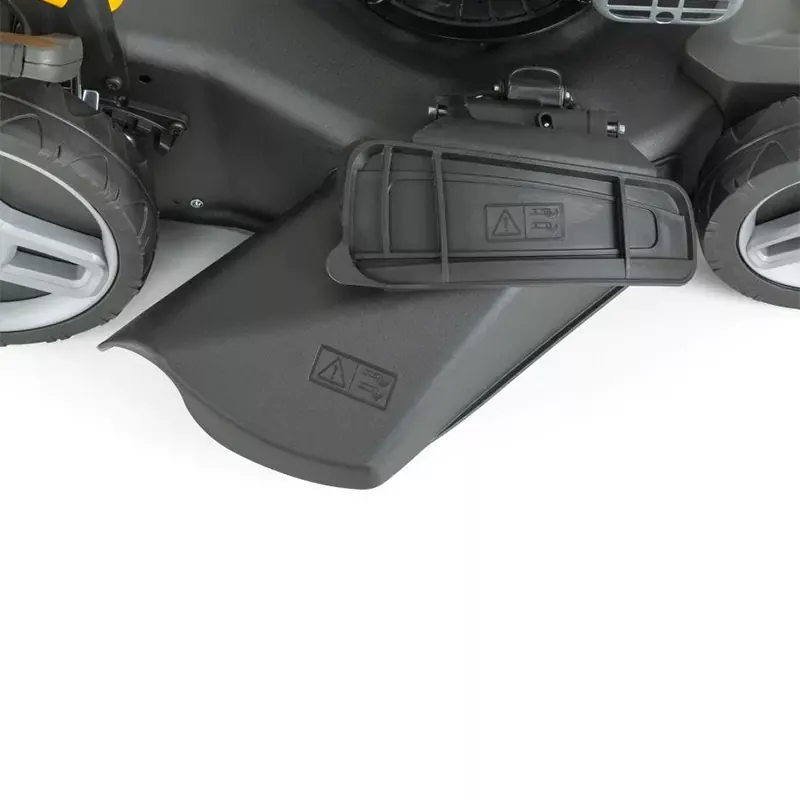 Гарантия на корпус двадцать лет. Ширина захвата скошенной травы 48 сантиметра. В передней части деки установлена защитная пластина, для лучшего подрезания травы. Регулировка высоты стрижки центральная и имеет шесть положений высоты скоса от 22-80 мм.