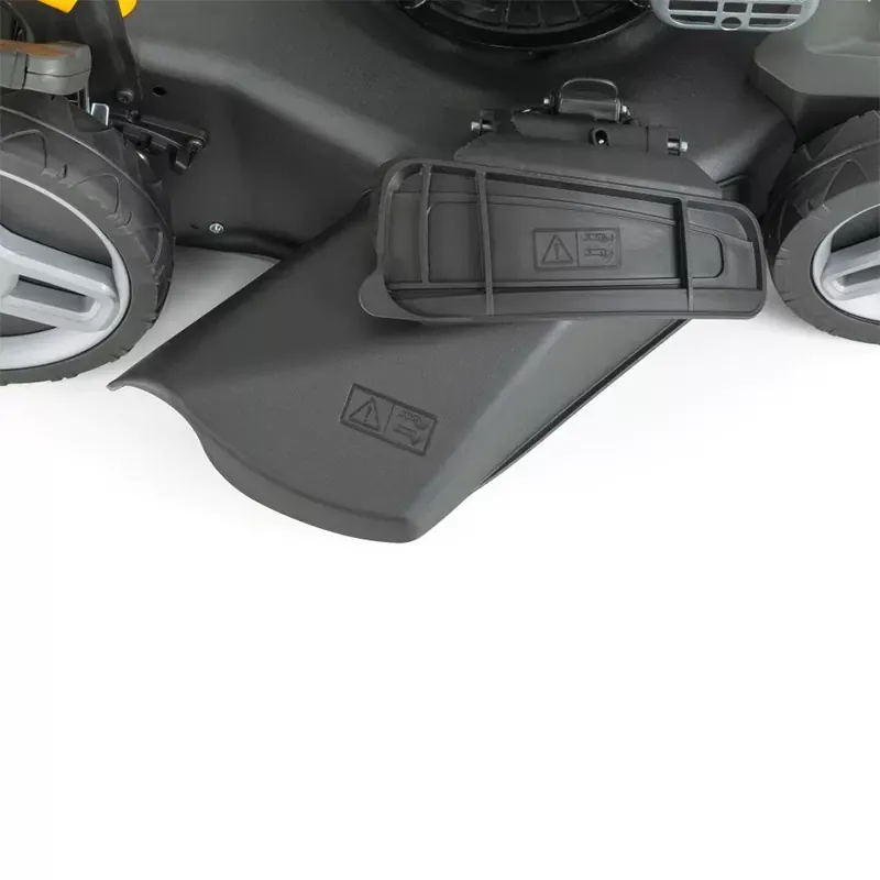 Высота стрижки настраивается вручную в диапазоне от 22 до 80 мм. Для этого у заднего колеса расположен 6-ступенчатый регулятор. Это позволит как аккуратно подрезать самые кончики, так и срезать траву под самый корень.