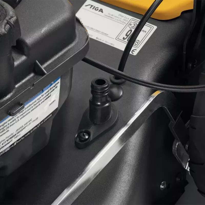 В модели используется двигатель Briggs & Stratton. Запатентованная конструкция мотора исключает утечку масла или бензина при хранении газонокосилки в вертикальном положении.
