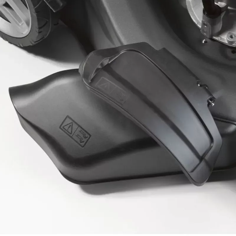 Если вы не хотите очищать травосборник, то в косилке предусмотрен боковой выброс. При его применении вся срезанная растительность будет вылетать через специальное отверстие в сторону.
