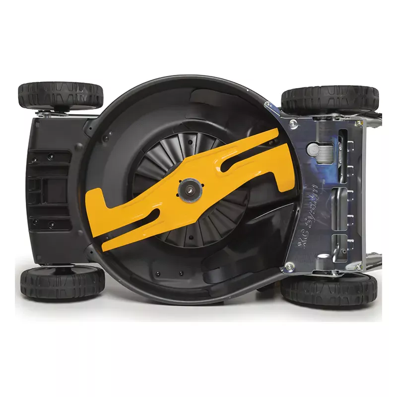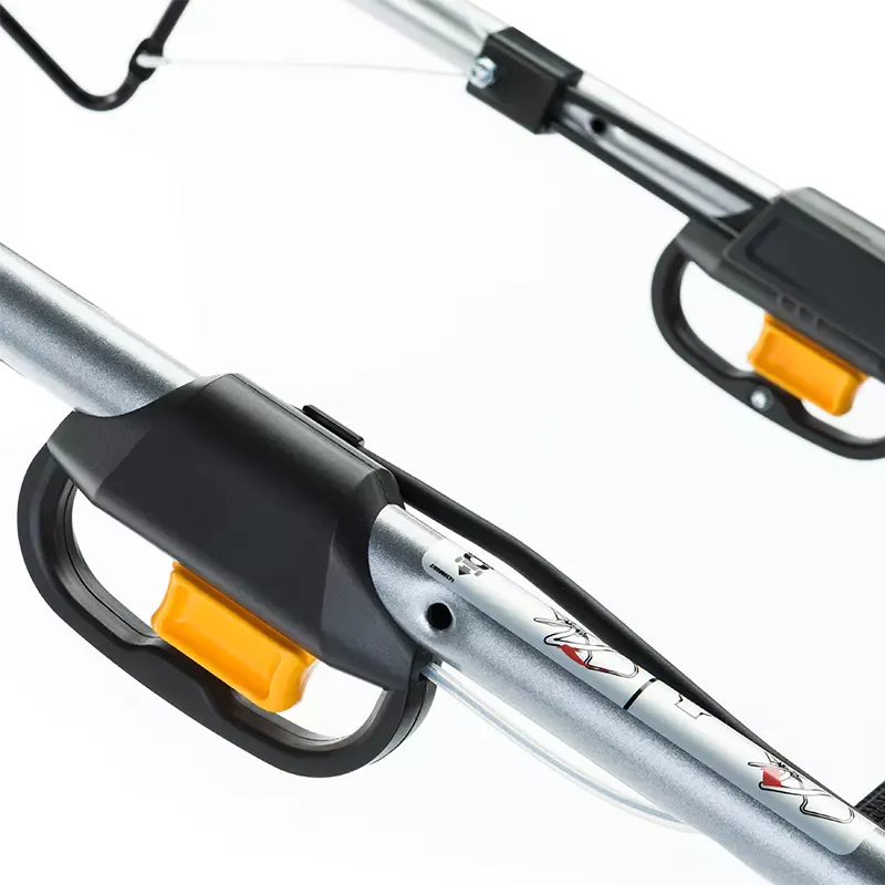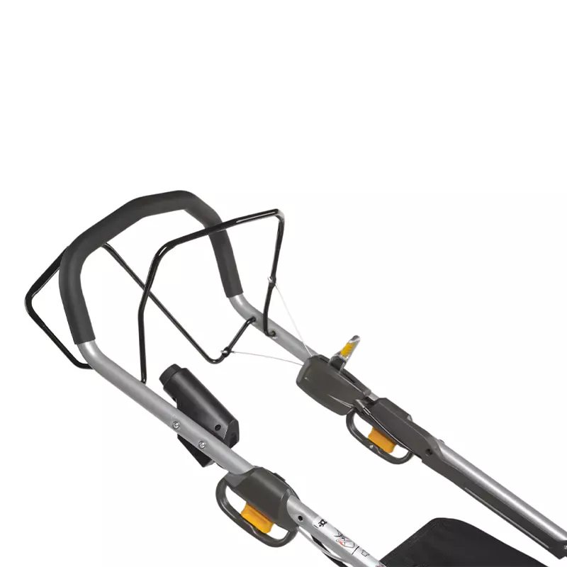 Двигатель бензиновой газонокосилки заводится нажатием кнопки. С помощью удобного переключателя на рукоятке можно выбрать комфортную скорость движения. Управление осуществляется двумя прижимными рычагами, которые отвечают за привод на задние колеса и режущий механизм.