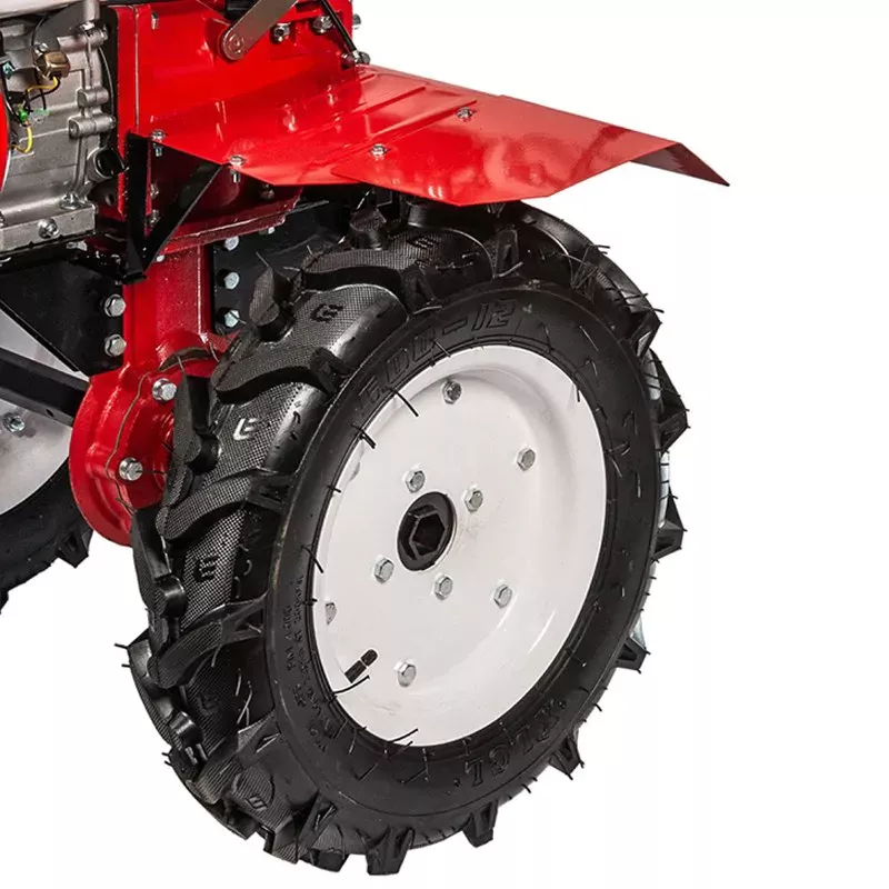 - Большие пневматические колёса 5х12 или 19х7х8 (в зависимости от комплектации) обеспечивают отличную проходимость мотоблока по местности.