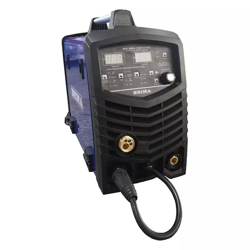 Сварочный полуавтомат BRIMA DIGITAL MIG/MMA-230 выдает максимальный сварочный ток в 230 А, оснащен 2 дисплеями, а также встроенным подающим механизмом проволоки. Для предотвращения разрыва цепи во время работы в режиме MMA, есть байонетные разъемы.