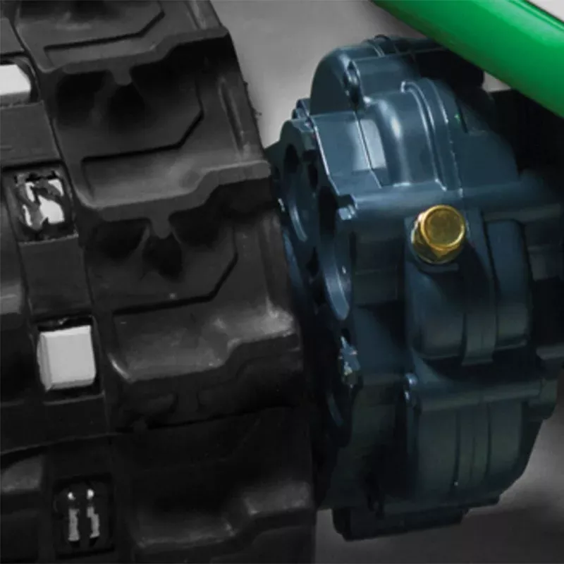 Гусеничный привод с автоматическим натяжением. Широкая поверхность гусениц позволяет обеспечить отличное сцепление с поверхностью и снизить давление на грунт, поэтому косилка способна не только срезать грубую растительность, но и работать на газоне, не оставляя на нем следов. Механизм привода оснащен автоматическим натяжителем гусеничной ленты, поэтому она не соскакивает с колес и роликов при возникновении нештатной ситуации или при растяжении в ходе длительной эксплуатации.