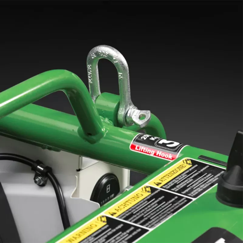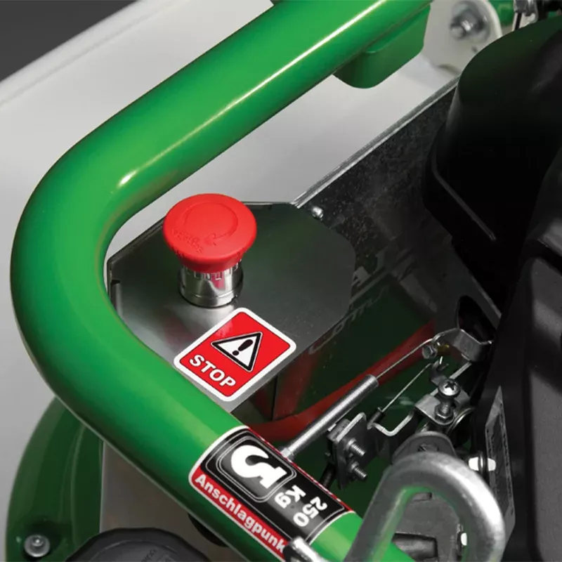Радиоуправление с расстоянием передачи сигнала до 200 м. Благодаря дистанционному управлению оператор все время находится на расстоянии от машины, которое гарантирует ему комфорт и безопасность: вы не подвергаетесь риску упасть на склоне, не дышите выхлопными газами и пылью, не испытываете шумовую нагрузку. Пульт управления представляет собой бесконтактный оптический джойстик, обеспечивающий полный и точный контроль, взаимодействует с датчиками машины для исключения опасного маневрирования. Класс защиты IP65 (исключается попадание пыли и капель дождя). Автоматический поиск частоты (AFA).