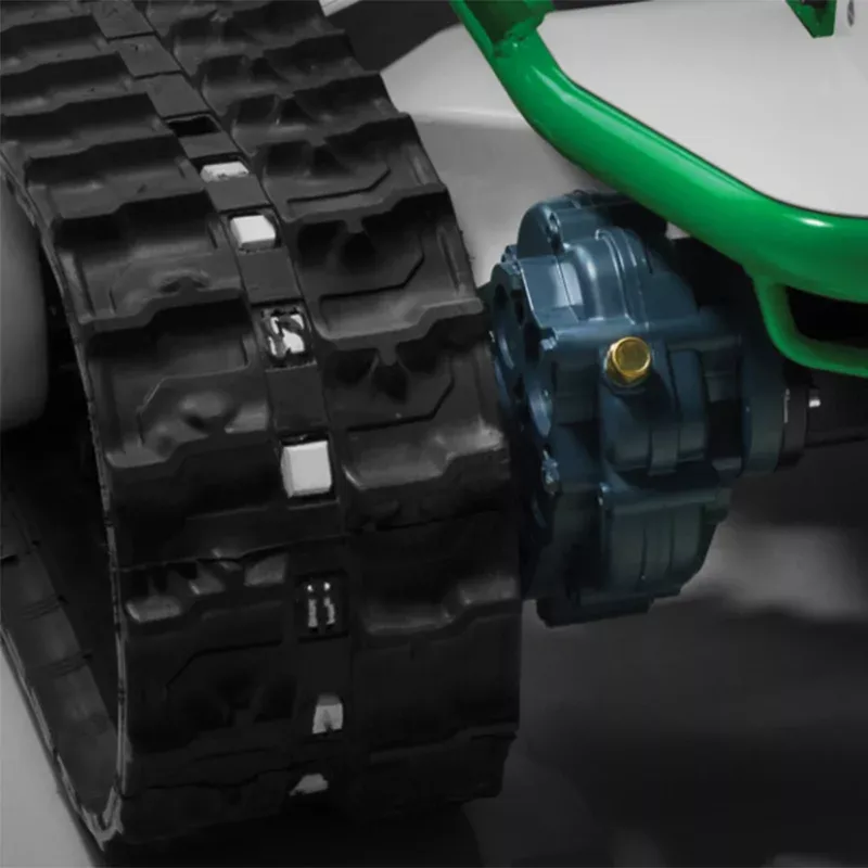 Гусеничный привод с автоматическим натяжением. Широкая поверхность гусениц позволяет обеспечить отличное сцепление с поверхностью и снизить давление на грунт, поэтому косилка способна не только срезать грубую растительность, но и работать на газоне, не оставляя на нем следов. Механизм привода оснащен автоматическим натяжителем гусеничной ленты, поэтому она не соскакивает с колес и роликов при возникновении нештатной ситуации или при растяжении в ходе длительной эксплуатации.