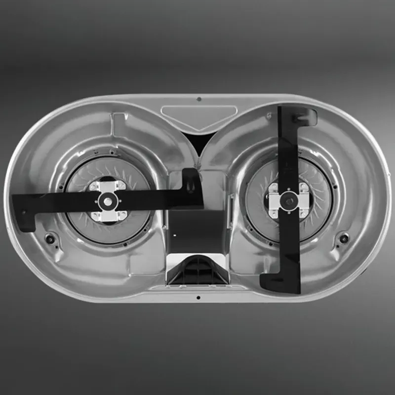 Перпендикулярно установленные ножи с синхронным вращением На газонокосильной деке UniDeck ножи установлены перпендикулярно. Они вращаются синхронно под углом 90° по отношению друг к другу. За счет этого достигается высокая эффективность кошения травы и ее сбора в травосборник. Такая конструкция исключает образование участков нескошенной травы между ножами при маневрировании машины.