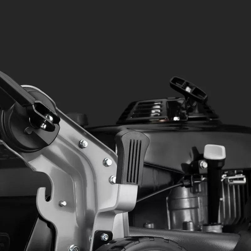 Профессиональная рукоятка Рукоятка соединена с корпусом газонокосилки с помощью мощного стального кронштейна. Такая конструкция позволяет выдерживать серьезные длительные нагрузки. Удобный хват рукоятей позволяет с легкостью управлять машиной даже на неровном рельефе. Зубчатая рейка регулировки металлическая, а потому прочная и износостойкая. Благодаря автоматической защелке нет необходимости использовать гайки.