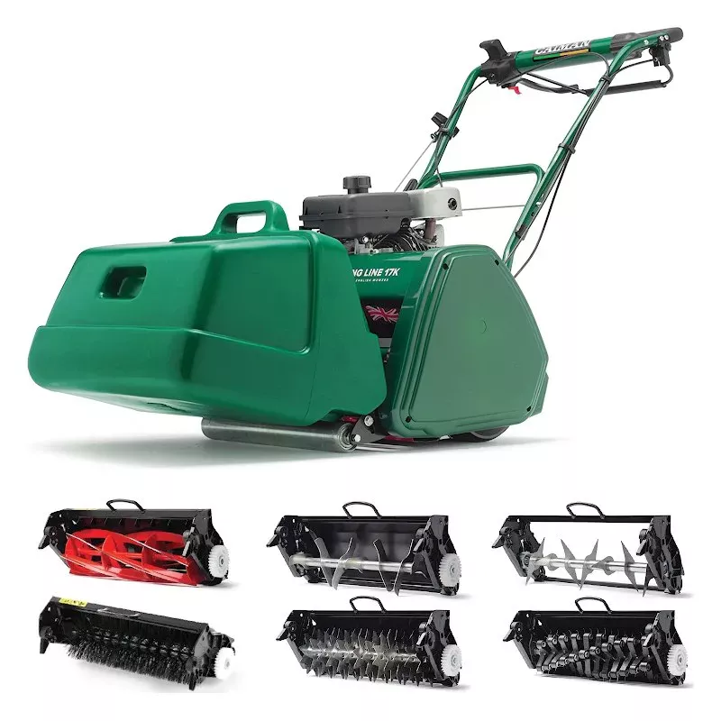 Бензогазонокосилка Caiman KING LINE 17H (в комплектации MAX) - модель барабанного типа со сменными рабочими картриджами, самоходная, оснащенная бензиновым двигателем. В комплект машины входит 6 насадок: режущий барабан, аэратор, вычесыватель, вертикуттер, газонная щетка и скарификатор. Таким образом, вы сразу покупаете целую систему по уходу за газоном, при помощи которой вы сможете производить стрижку травы, вычесывать солому, прокалывать дерн для улучшения воздухообмена в прикорневом слое, убирать загрязнения и разуплотнять верхний слой почвы.
