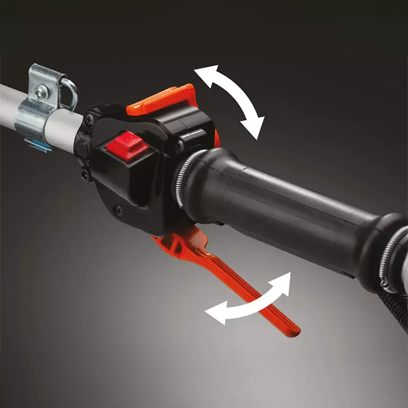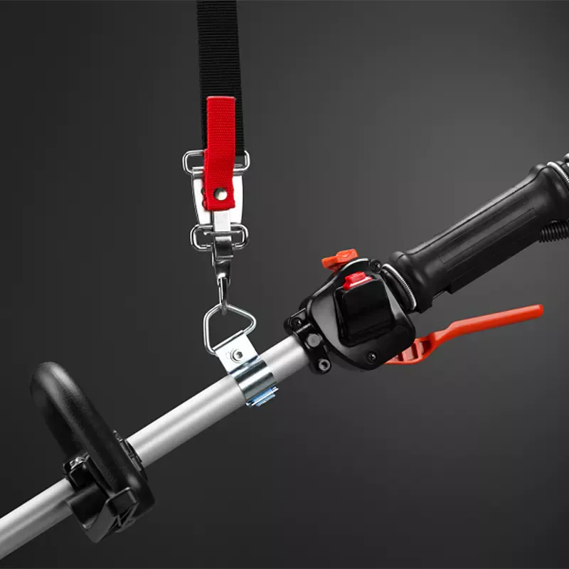 Держатель с телескопическим механизмом регулируется по длине. Это и наплечный ремень позволяю эксплуатировать аппарат комфортно даже длительное время. В комплекте присутствуют защитные очки и универсальный кожух, которые обеспечивают безопасный скос и подравнивание даже жесткой травы.