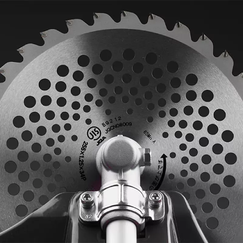 Аккуратность среза обусловлена диаметром диска – 23 см. Максимальная рабочая скорость двигателя – 11700 об/мин. Это обеспечивает быструю обработку участка и чистый вид газона.