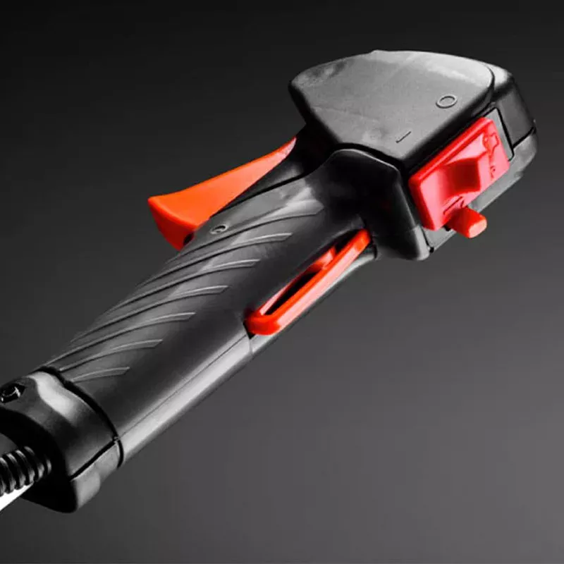 Универсальная рукоятка с приводом дроссельной заслонки, клавишей выключения зажигания позволяет контролировать число оборотов двигателя, исключает случайное нажатие на курок газа. Для экстренных ситуаций есть кнопка моментальной остановки двигателя.