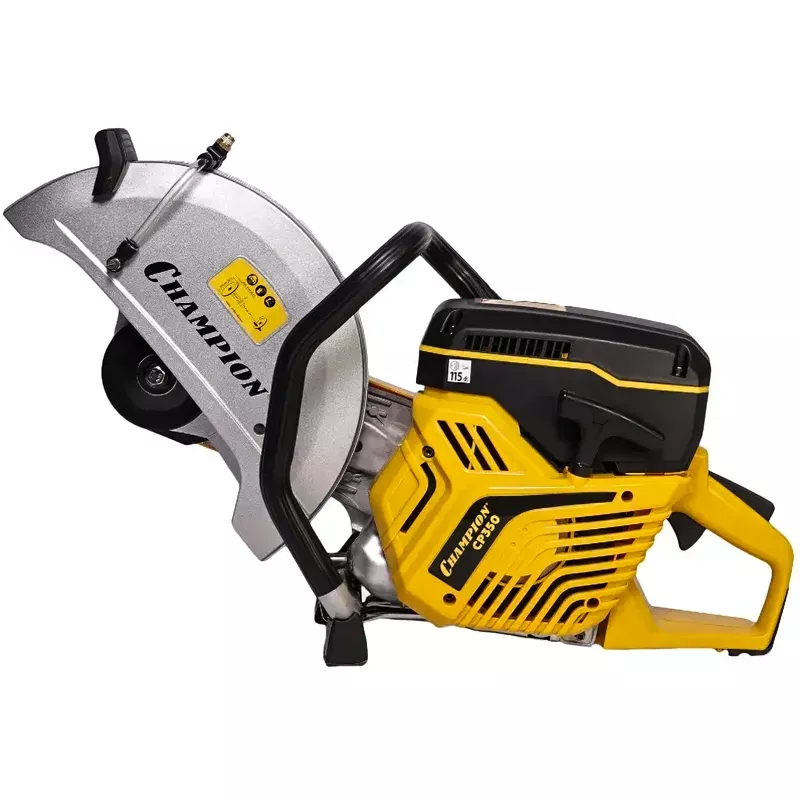 Бензорез CHAMPION CP350 используется с диском диаметром до 350 мм, обеспечивая максимальную глубину реза материала 125 мм. В комплект входят ключи, емкость для приготовления топлива, отвертка и ремень.