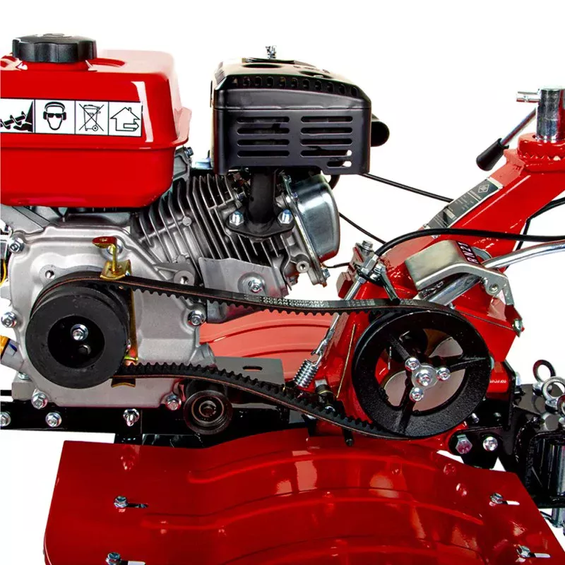 Бензиновый мотоблок оснащен сцепкой с тремя пальцами в комплекте. В передней части расположена сервисная рукоятка. Она нужна для удобной смены навесного оборудования. Мотоплуг обладает прочной конструкцией. Металлические шайбы изготовлены из металла и надежно защищают сальники редуктора от повреждений. Шкивы и трансмиссия с ременно-цепной передачей выполнены из чугуна.