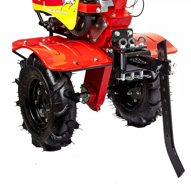 Над каждый колесом расположено широкое защитное крыло. Оно ограждает вас от комков грязи и частичек растительности. Руль регулируется в вертикальной и горизонтальной плоскостях. На его держателях есть накладки из нескользящего материала. Они обеспечивают надежный хват при управлении мотоблоком.
