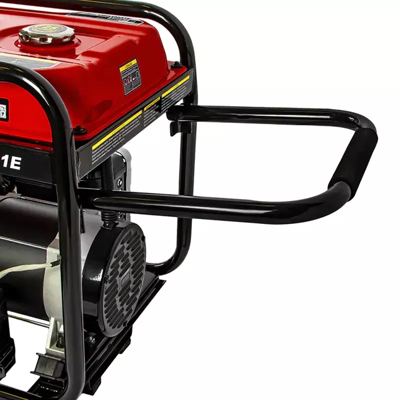 Бензиновая электростанция оснащена защитной рамой, которая представляет собой металлическую трубу, огибающую весь корпус. Она не только оберегает от механических воздействий, но и является устойчивым основанием. На раму крепятся колеса из комплекта с протектором для лучшего сцепления с поверхностью. За счет них генератор намного проще перемещать по рабочему помещению или строительной площадке на улице.
