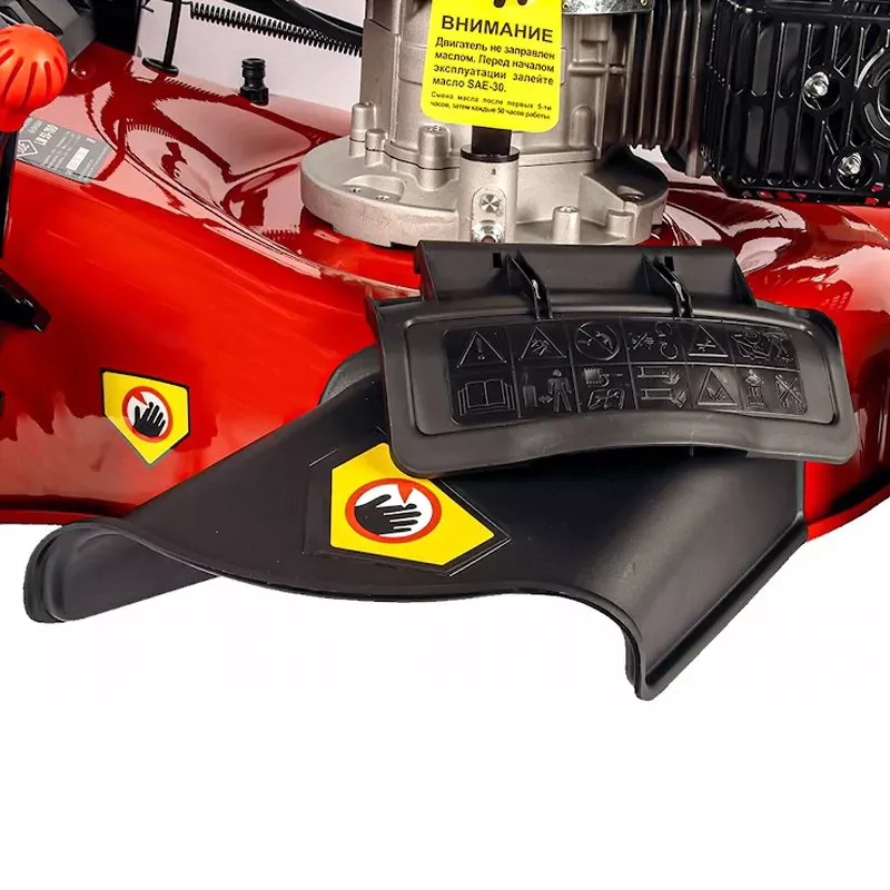 Бензиновая газонокосилка поддерживает четыре режима стрижки: со сбором в контейнер, выбросом назад и в сторону, мульчированием. Первый вариант подойдет для получения чистого и аккуратного газона, второй и третий — удобны для скашивания высокой и влажной травы. В режиме бокового выброса срезанные растения не мешаются под ногами. При установке ножа для мульчирования скошенная растительность измельчается и попадает на газон в качестве естественного удобрения. Управление осуществляется с помощью двух рычагов на рукоятке, запускающих вращение ножа и привод на колеса. Газонокосилка движется самостоятельно. Оператору требуется только слегка ее направлять.