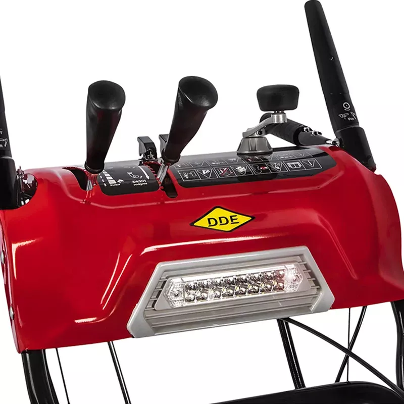 Все элементы управления бензинового снегоуборщика DDE удобно расположены под рукой на панели оператора. Направление и дальность выброса снега можно регулировать с помощью рычагов, не останавливая снегоочиститель. Наличие шести передач переднего хода и двух скоростей заднего хода обеспечивает высокую маневренность машины. В зависимости от плотности и высоты снежного покрова можно выбрать необходимый темп передвижения.