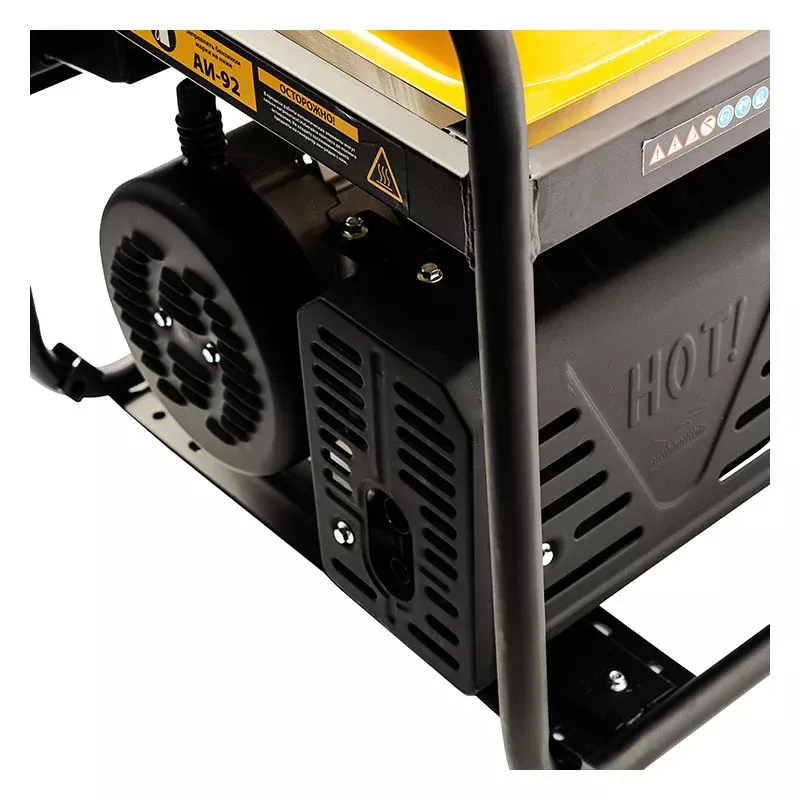Для подключения бытового прибора или электроинструмента на корпусе размещены три розетки: две стандартные на 16 А, а также одна силовая на 32 А, чтобы подключать промышленное оборудование. Все выходы оснащены защитными крышками, которые не допускают попадания пыли и грязи внутрь, позволяя хранить генератор в старом помещении или на улице. За счет вместительного топливного бака и экономного потребления бензина, полной заправки хватает на 8,5 ч непрерывной работы генератора. Этого вполне достаточно для использования данной модели на дачном участке, в домашней мастерской или на строительной площадке.