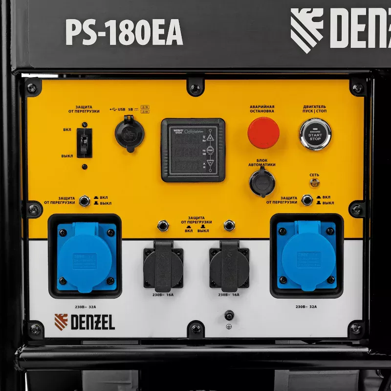 Бензиновый генератор Denzel PS-180EA 946974 максимальной мощностью 18 кВт, с баком объемом 65 л, разъемом ATS и электрическим стартером, поддерживает напряжение в сети 230 В. Предназначен для обеспечения питанием приборов и оборудования в случае отсутствия стационарной сети или перебоев в ее работе. Разъем USB 5 В позволяет заряжать мобильные устройства. Подключение потребителей производится при помощи 2-х розеток 230 В/16 А, а также 2-х силовых розеток 230 В/32 А.