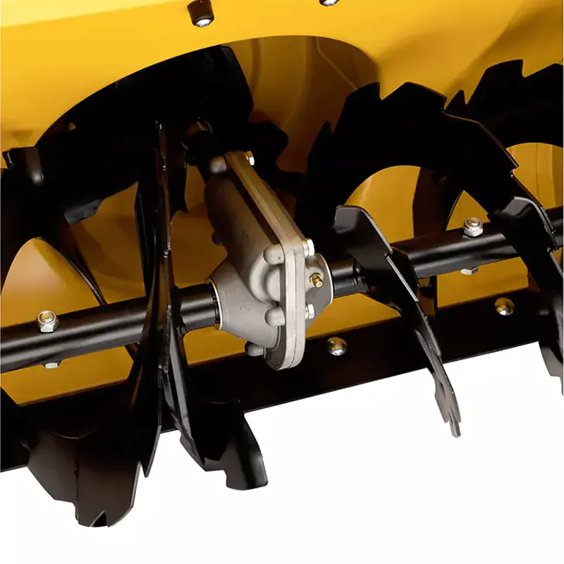 Модель оборудована стальным шнеком с острыми зубьями. За счет этого техника справляется с измельчением плотных комков слежавшегося или даже заледеневшего снега.