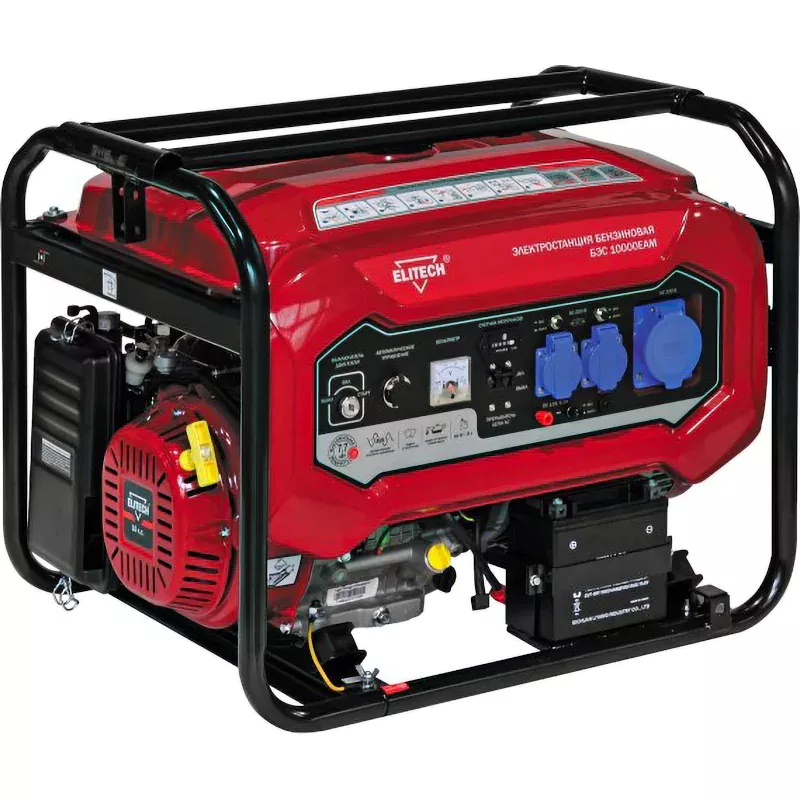 Бензиновый генератор Elitech БЭС 10000ЕМ используется для автономного питания инструментов и приборов суммарной мощностью до 7 кВт. Для простого и быстрого запуска предусмотрен электростартер, а аккумулятор поставляется в комплекте.