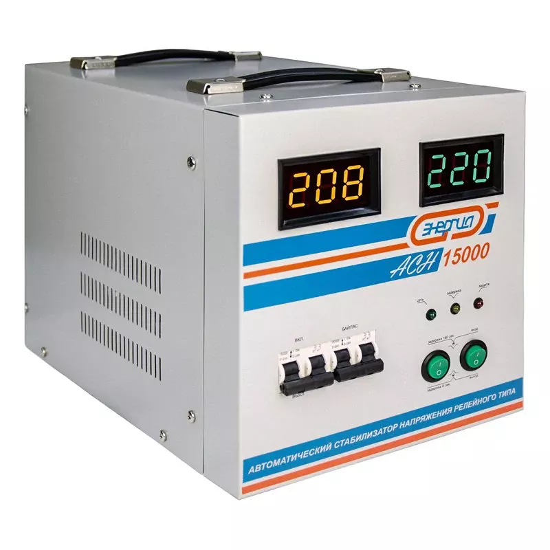 Релейный однофазный стабилизатор напряжения переменного тока предназначен для стабилизации переменного напряжения в сети электроснабжения для потребителей бытового и аналогичного назначения. Изделие относится к классу автотрансформаторных стабилизаторов со ступенчатым регулированием напряжения путем переключения отводов силового автотрансформатора с помощью электромеханических силовых реле, таким образом стабилизаторы Энергия АСН регулируют напряжение по релейному принципу.