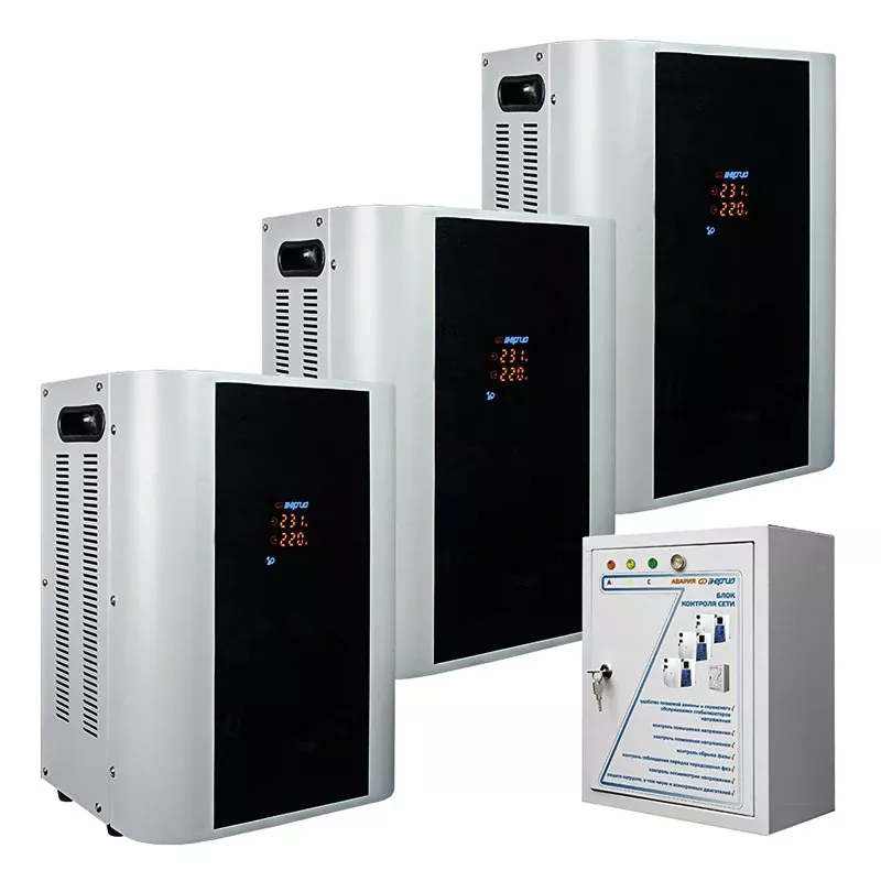 Трехфазный стабилизатор напряжения СНВТ ЭНЕРГИЯ HYBRID предназначен для стабилизации переменного напряжения в сети электроснабжения для потребителей общепромышленного, бытового и аналогичного назначения. Изделие относится к классу автотрансформаторных стабилизаторов со смешанным релейно-сервоприводным регулированием с помощью электромеханических реле и сервомотора. Изделие соответствует требованиям российских и международных стандартов. Технические условия и нормативная база на изделие устанавливаются стандартом предприятия SCT/008-2009.
