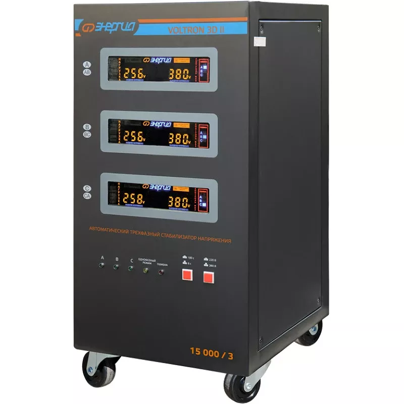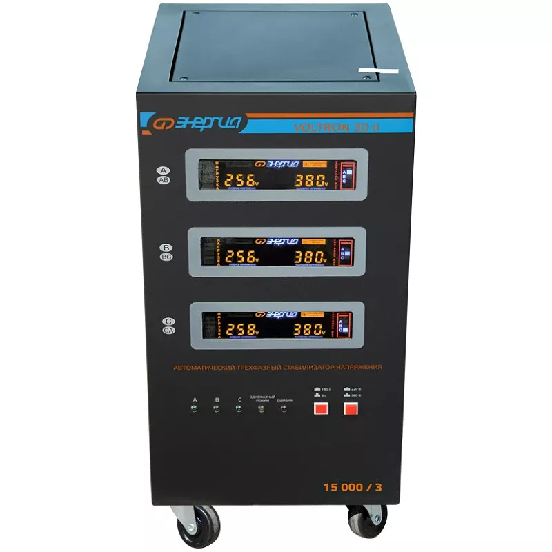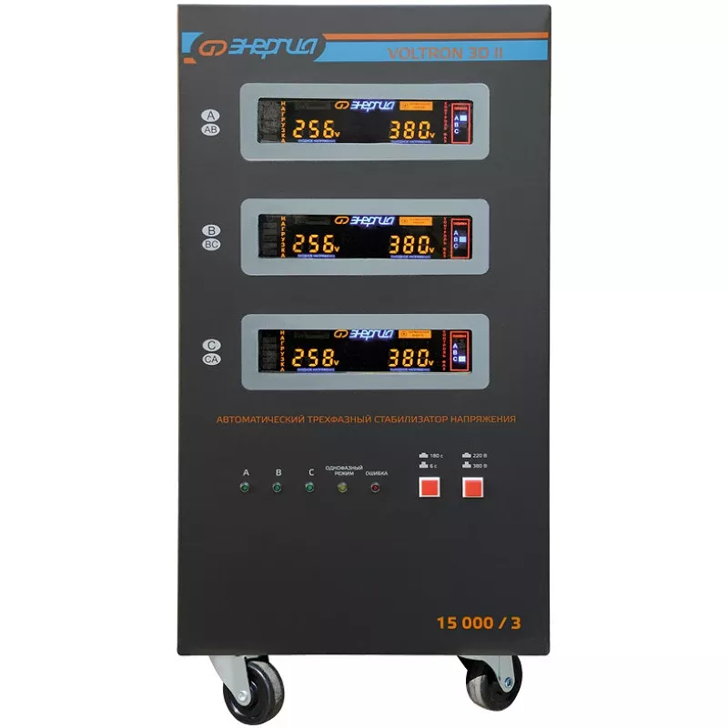 В обновлённой линейке трёхфазных стабилизаторов напряжения Энергия VOLTRON 3D II возможен выбор работы стабилизатора либо в трёхфазном режиме работы (для 3–фазных потребителей), либо в 1-фазном режиме работы.