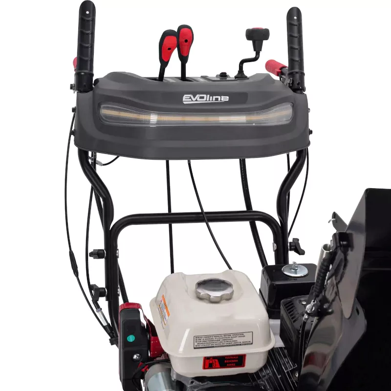 Модель EVOline SBG610HE имеет богатую стандартную комплектацию: LED-фару, подогрев рукояток управления, легкий запуск двигателя от АКБ, а также оснащен такими функциями, как: отключение блокировки дифференциала с помощью курков и управление снегоуборочной машиной одной рукой.
