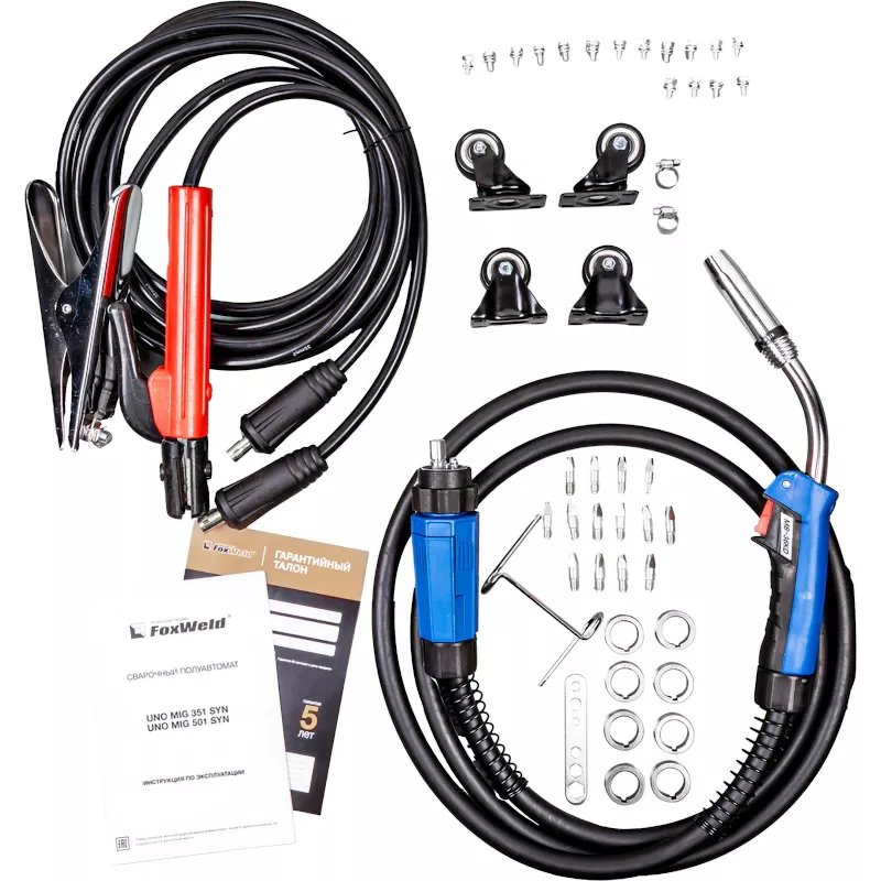 Горелка, хомуты для газового шланга, комплект роликов и наконечников позволяют быстро приступить к работе.