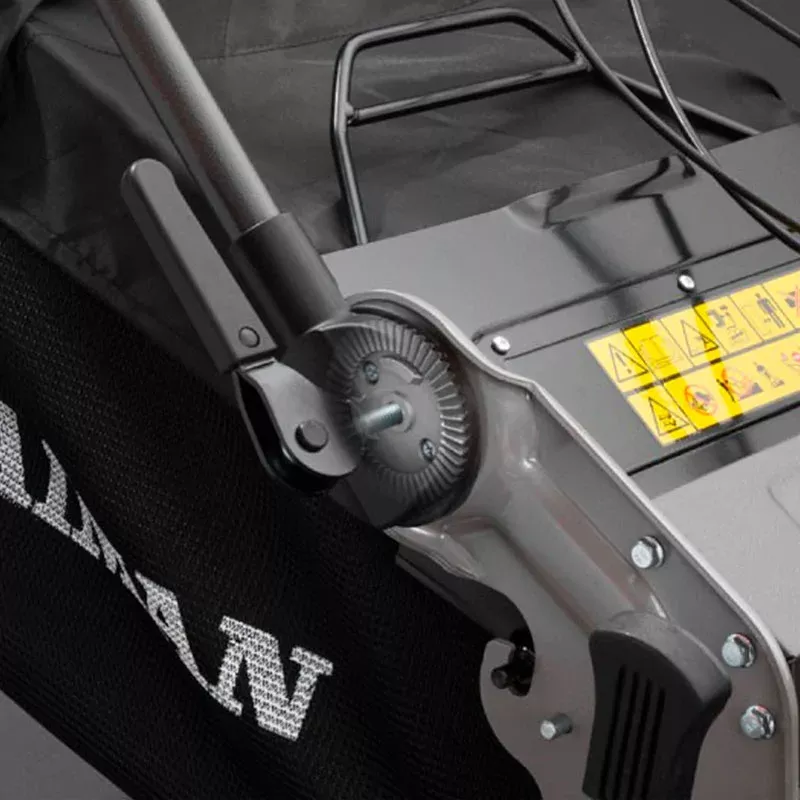Высота рукояти фиксируется автоматической алюминиевой защёлкой. Благодаря её удобному хвату машиной одинаково комфортно управлять на ровной площадке и на сложном рельефе. Стальной кронштейн крепления ручки рассчитан на самые высокие механические нагрузки.