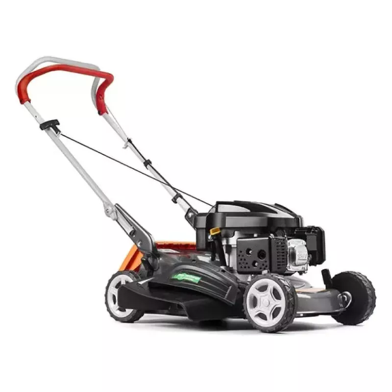 Бензиновая газонокосилка оборудована системой легкого старта, благодаря которой для вытягивания пускового троса не нужно прикладывать особых усилий. Обороты двигателя и дроссельная заслонка регулируются автоматически, поэтому элементы управления очень простые. Во время запуска и работы устройства нужно прижимать рычаг сцепления к рукоятке, а для остановки — просто отпустить. Каждое колесо оборудовано рычагом регулировки высоты кошения, который легко устанавливается в нужное положение одним движением. Поддерживаются три режима: скошенная трава либо измельчается и возвращается на газон в виде мульчи, либо выбрасывается назад или в сторону.