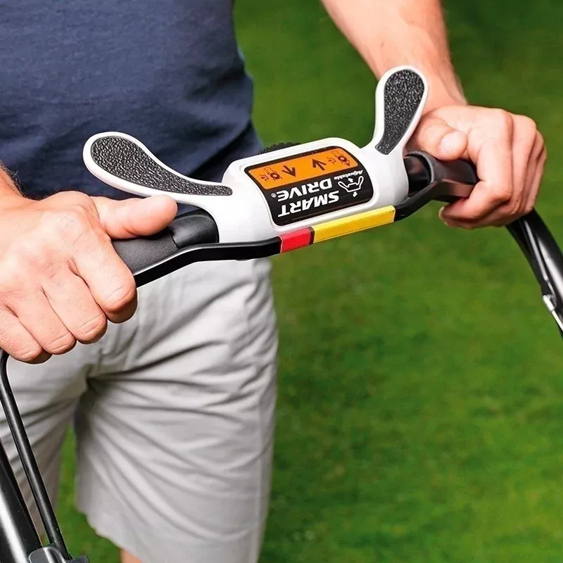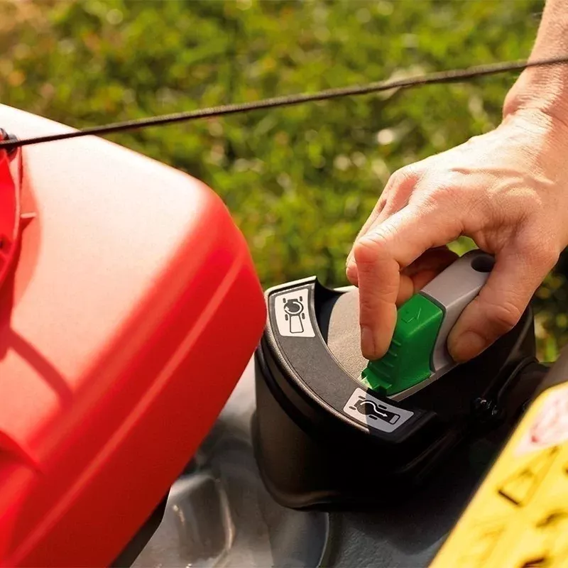 Рукоятка крепится зажимами для удобной регулировки по высоте. Основные элементы управления вынесены на держатель для комфортной работы. Рукоятка складная и позволяет сэкономить место при хранении. Широкий протектор колес гарантирует отсутствие следов на газоне.