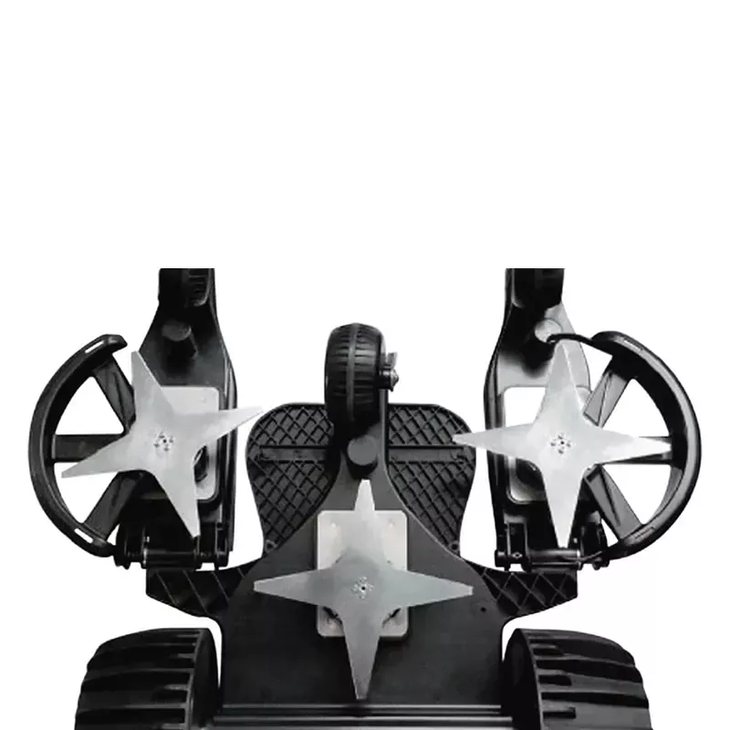 Три режущих ножа в форме 4-конечной звезды (диаметром 29 см каждый) изготовлены из нержавеющей стали со специальной лазерной заточкой для выполнения ровного и быстрого среза на любом типе газона в течение длительного времени. Не требует заточки и балансировки. Рекомендуемая периодичность замены ножей - примерно 1 раз в год.