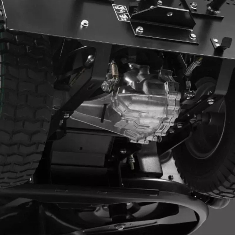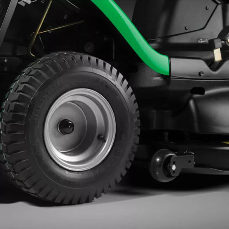 Большая площадь касания снижает давление на грунт, а специальный мелкий рисунок протектора снижает риск повреждения деликатного газона.